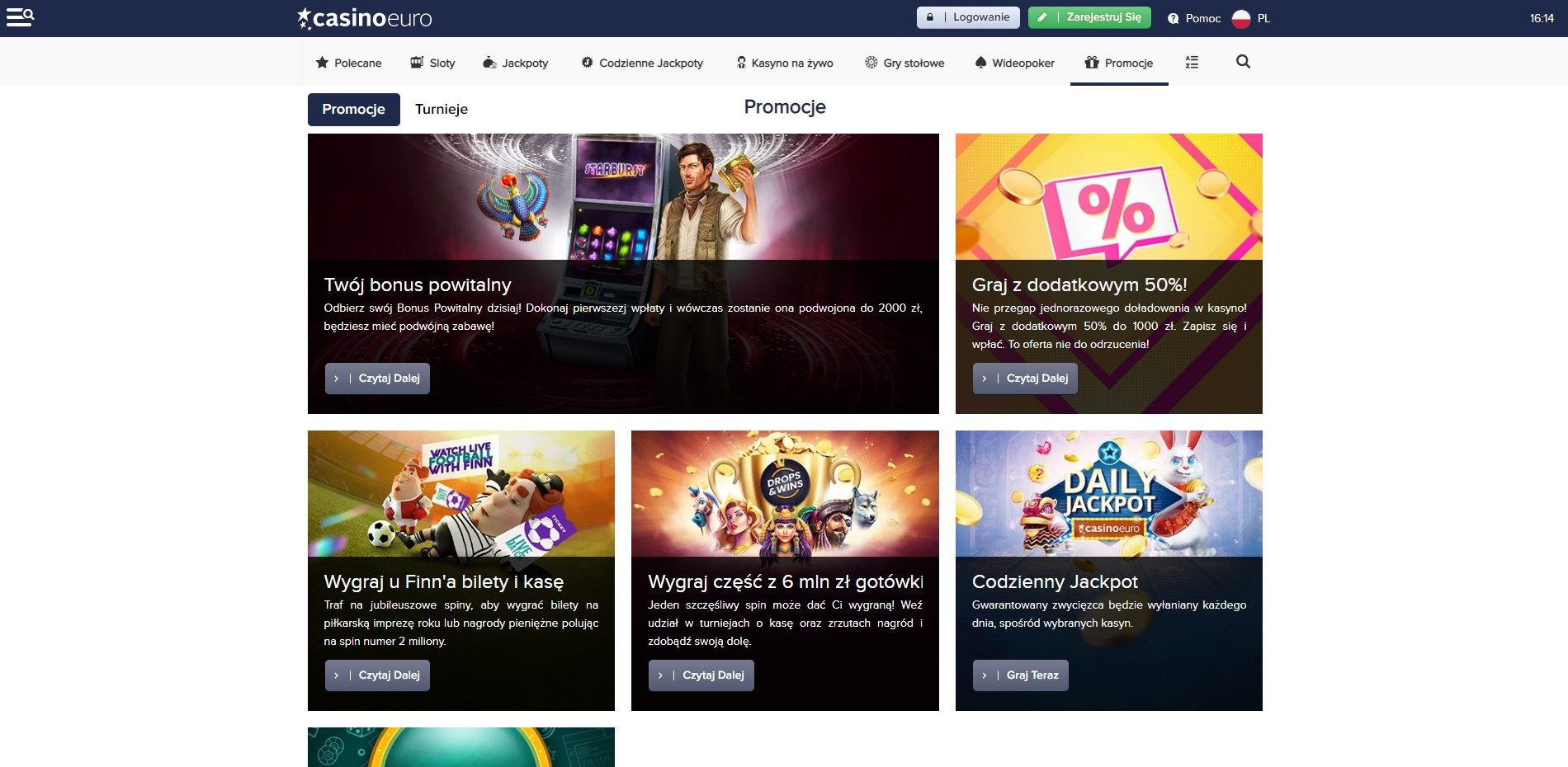 Wspólnie z Red Tiger Gaming w kasynie obowiązuje promocja na codzienny jackpot. W wybranych tytułach od tego producenta dostępna jest w każdym dniu określona suma jackpotu do wygrania. Mowa tu o kwotach nawet rzędu kilkuset tysięcy złotych. Regularnie również organizowane są turnieje o łącznej puli aż 6 milionów złotych. W ofercie dostępny jest także Turniej Spinów, gdzie można wygrać gotówkę, jak i bilety na mecze piłkarskie. Wszystkie promocje w kasynie dostępne są nie tylko na komputerze, lecz także w CasinoEuro na telefon i inne urządzenia mobilne.